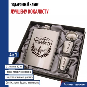 Набор 4 в 1 включает в себя стальную фляжку серебряного цвета (с надписью), что идеально подходит для крепкого или безалкогольных напитков (алкоголя, коньяка, виски, воды и др.).