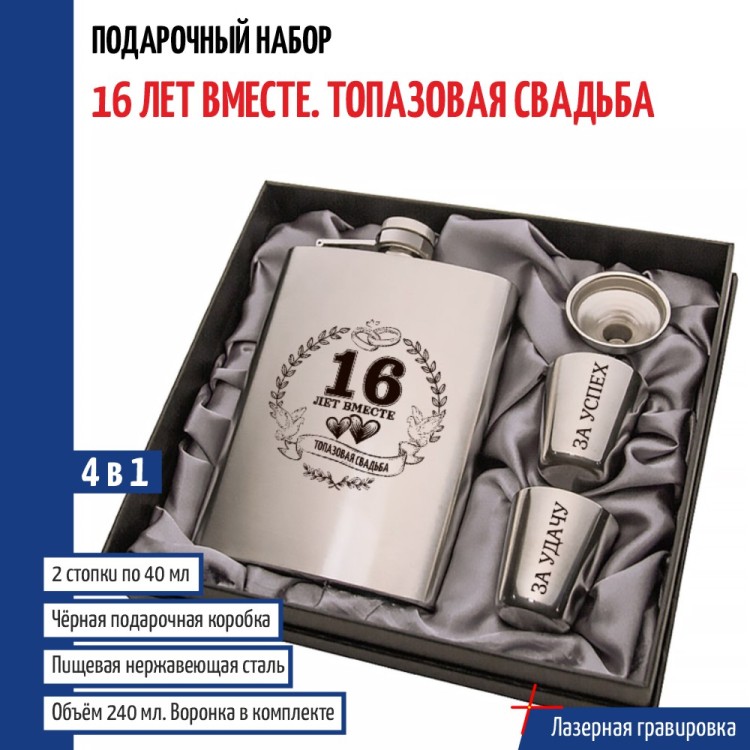 | Комплектация | Фляжка (240 мл), Воронка, Две стопки (по 30 мл) |