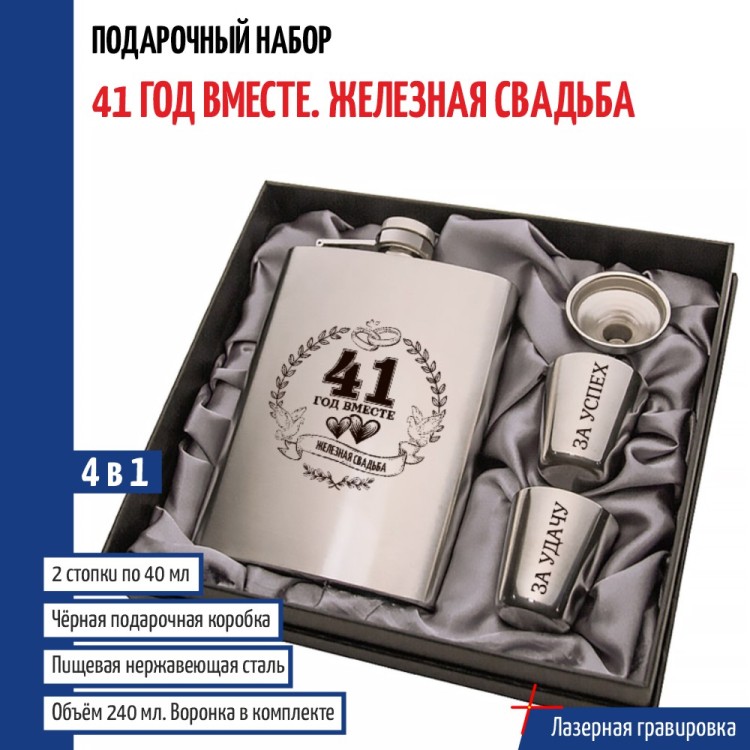| Комплектация | Фляжка (240 мл), Воронка, Две стопки (по 30 мл) |