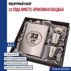 | Комплектация | Фляжка (240 мл), Воронка, Две стопки (по 30 мл) |