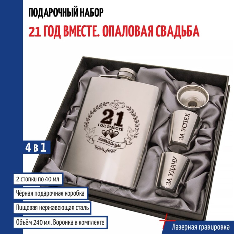 Набор 4 в 1 включает в себя стальную фляжку серебряного цвета (с надписью), что идеально подходит для крепкого или безалкогольных напитков (алкоголя, коньяка, виски, воды и др.).