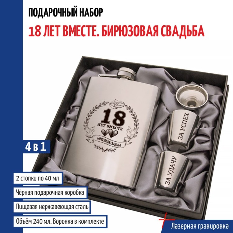 | Комплектация | Фляжка (240 мл), Воронка, Две стопки (по 30 мл) |