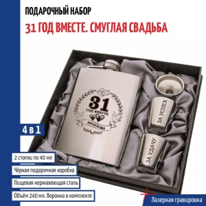 | Комплектация | Фляжка (240 мл), Воронка, Две стопки (по 30 мл) |