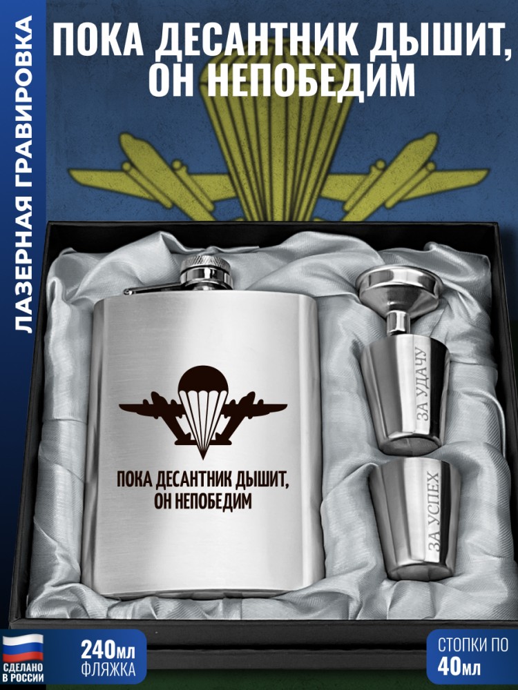 | Комплектация | Фляжка (240 мл), Воронка, Две стопки (по 30 мл) |