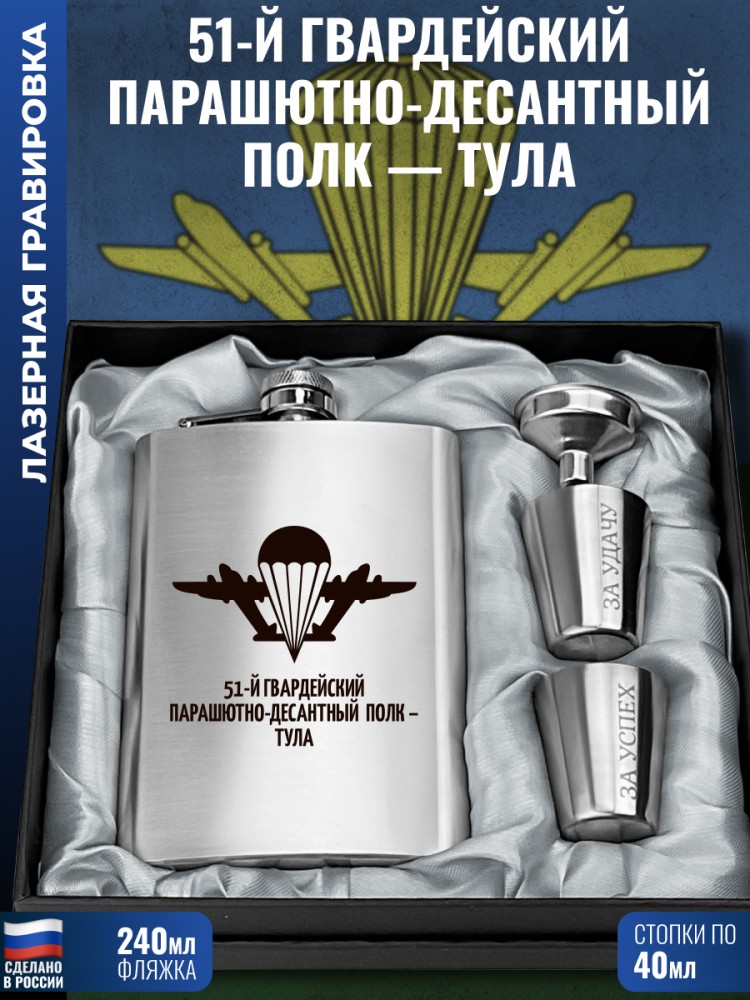 | Комплектация | Фляжка (240 мл), Воронка, Две стопки (по 30 мл) |