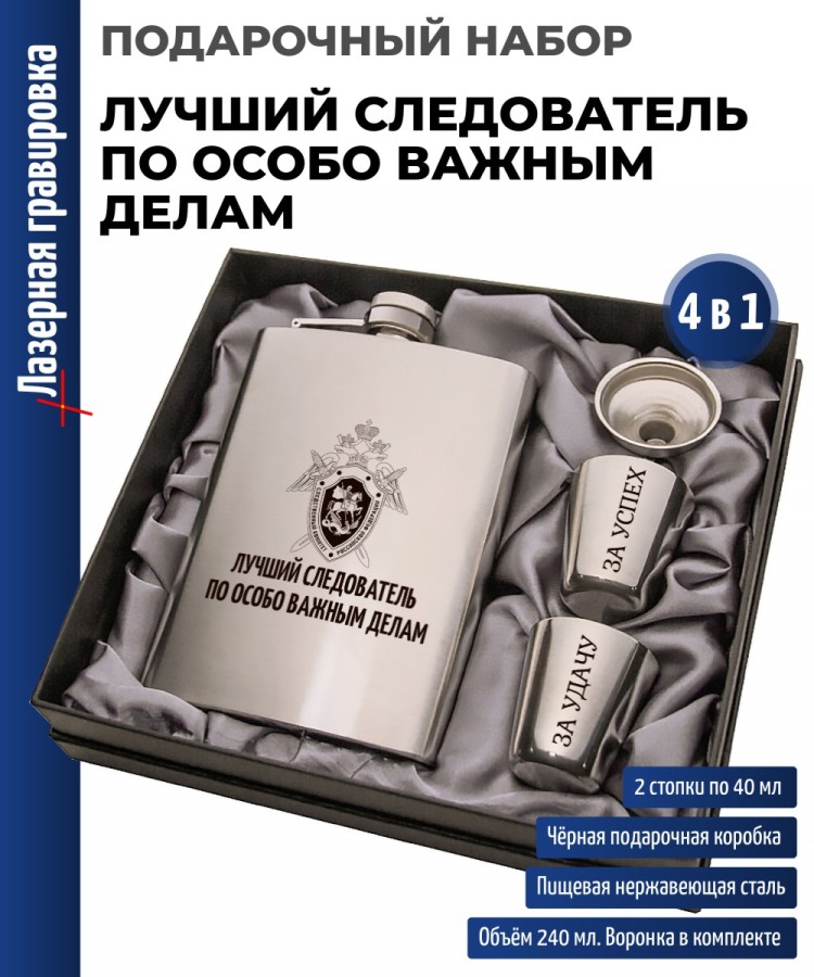 | Комплектация | Фляжка (240 мл), Воронка, Две стопки (по 30 мл) |