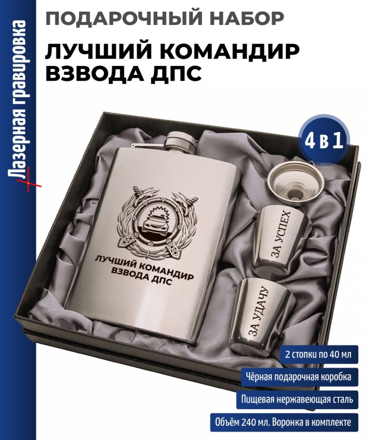 | Комплектация | Фляжка (240 мл), Воронка, Две стопки (по 30 мл) |