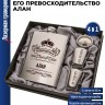 Набор 4 в 1 включает в себя стальную фляжку серебряного цвета (с надписью), что идеально подходит для крепкого или безалкогольных напитков (алкоголя, коньяка, виски, воды и др.).
