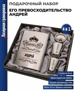 Набор 4 в 1 включает в себя стальную фляжку серебряного цвета (с надписью), что идеально подходит для крепкого или безалкогольных напитков (алкоголя, коньяка, виски, воды и др.).