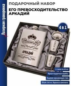 Набор 4 в 1 включает в себя стальную фляжку серебряного цвета (с надписью), что идеально подходит для крепкого или безалкогольных напитков (алкоголя, коньяка, виски, воды и др.).