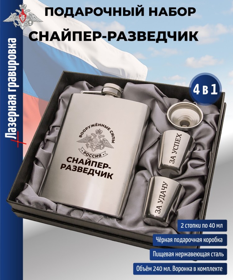 | Комплектация | Фляжка (240 мл), Воронка, Две стопки (по 30 мл) |