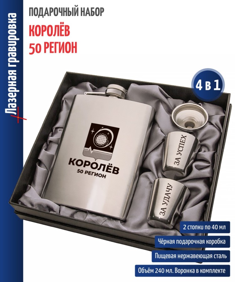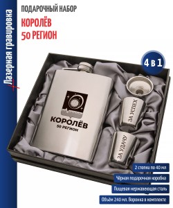 | Комплектация | Фляжка (240 мл), Воронка, Две стопки (по 30 мл) |
