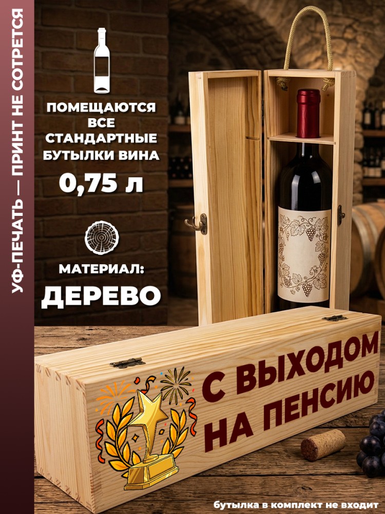 Размер: 35 × 10 × 10 см. Внутренний размер короба: 33.7 х 9 х 8.5 см. (подходит под большинство стандартных бутылок). Материал: Дерево (фанера). Деревянная коробка-пенал для бутылки вина, шампанского или другого алкогольного напитка.  Идеальный вариант упаковки для винной церемонии на свадьбу - подарить вино, шампанское или деньги молодожёнам, родителям от молодожёнов или просто близким друзьям.  Винная коробка примирения с пожеланиями - трогательный и стильный подарок. Подставка под винные бутылки в укомплектованном виде весьма элегантно смотрится на полке, выступая в роли изысканного элемента декора. Такая деталь добавляет в оформление интерьера особой утончённости и намекает на тонкий вкус хозяина. Естественно, такая вещица станет украшением любого стола. Держатель для бутылки вина - это оригинальный фиксатор, который создаёт иллюзию парящего в воздухе сосуда с алкогольным напитком. Конструкция получается надёжной, ведь бутыль удерживается благодаря тому, что создаётся противовес и горлышко фиксируется в отверстии за счёт распределения центра тяжести. Оригинальный подарок на любой праздник или награждение. Он станет достойной памятной наградой за победы и достижения от коллектива на память. Символизирует не только личные успехи, но и благодарность за труд и преданность делу. Актуально в качестве новогоднего сюрприза жене, мужу, отцу, взрослым родственникам (папе, дедушке, маме, бабушке), коллегам (начальнику), преподавателю или юбиляру. Такой красивый сувенир подходит для множества знаковых дат и событий дома и в офисе, на юбилеи родителей, международный женский день (8 марта), 14 и 23 февраля, Новый год или день рождения (ДР). Считается хорошим корпоративным подарком как для мужчин (сыну, брату, другу, любимому парню, руководителю), так и для женщин (начальнице, дочери, сестре, подруге или девушке). 0