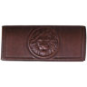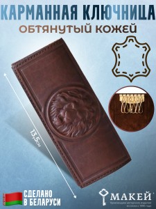 Карманная ключница имеет гладкий материал кожи, на котором нанесена художественная вставка в виде льва методом тиснения.