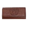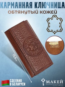Карманная ключница имеет текстурный материал кожи, на котором нанесена художественная вставка в виде льва методом тиснения.