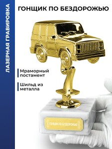 Наградная статуэтка с фигурой внедорожника на подставке. Подходит для размещения в интерьерах автоклубов и коллекциях призовых трофеев.
