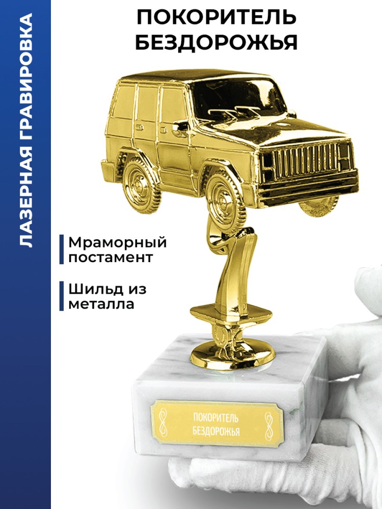 Наградная статуэтка с фигурой внедорожника на подставке. Подходит для размещения в интерьерах автоклубов и коллекциях призовых трофеев.