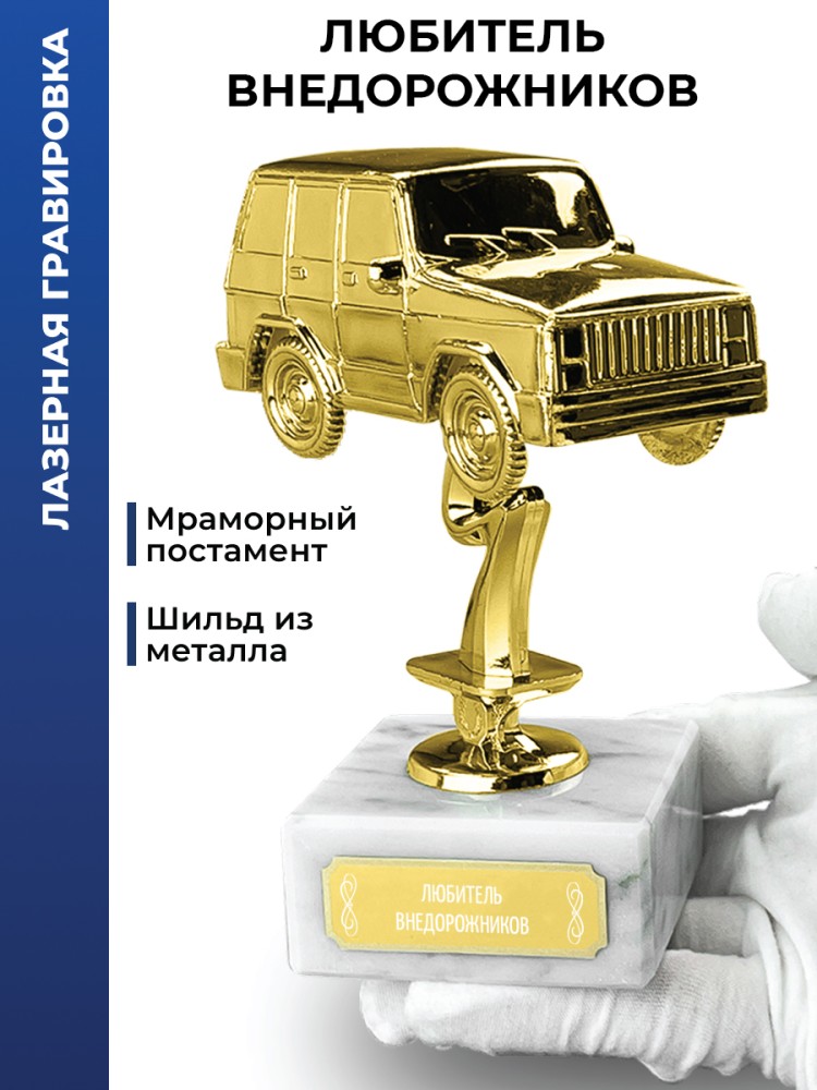 Наградная статуэтка с фигурой внедорожника на подставке. Подходит для размещения в интерьерах автоклубов и коллекциях призовых трофеев.