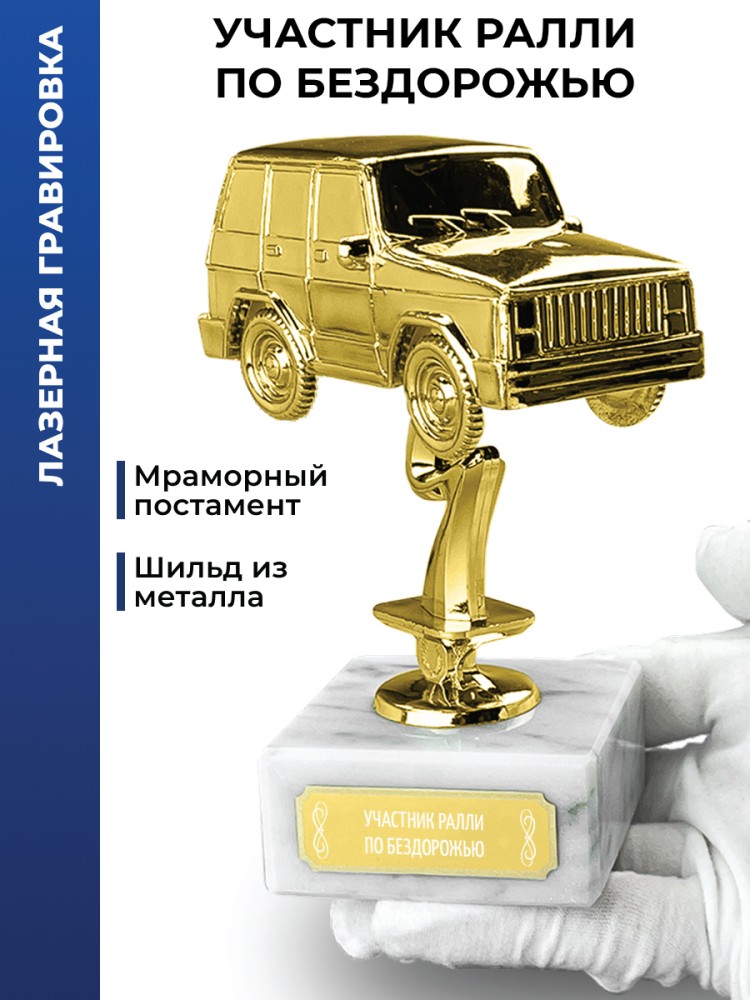 Лазерная гравировка нанесена на табличку (шильд), приклеенную к подставке. Размер: 14 x 6,5 x 6,5 см. Высота статуэтки без постамента: 11 см. Размер мраморной подставки: 6,5 x 6,5 x 3 см. Размер шильдика: 5 x 1,7 см. Материалы: Пластик (фигурка), Мрамор (постамент). Вес: 364 гр. Упаковка: Картонная коробка. Наградная статуэтка с фигурой внедорожника на подставке. Подходит для размещения в интерьерах автоклубов и коллекциях призовых трофеев. " Сувенир станет отличной памятной наградой за заслуги или победы, подходит как взрослым мужчинам (папе, дедушке, руководителю и начальнику) так и молодым парням (сыну подростку, брату, другу, любимому). Также актуально в качестве подарка и для взрослых женщин (маме, бабушке, коллеге, начальнице) или юным девушкам (дочери, сестре, подруге или любимой) Участник ралли по бездорожью демонстрирует мастерство управления автомобилем в сложных условиях. Такой спортсмен сочетает выносливость с точностью прохождения трассы. Участник ралли-рейд преодолевает протяжённые дистанции, где важны не только скорость, но и стратегия. Это испытание для тех, кто ценит адреналин и техническую подготовку. 2370