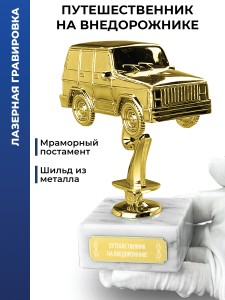 Наградная статуэтка с фигурой внедорожника на подставке. Подходит для размещения в интерьерах автоклубов и коллекциях призовых трофеев.