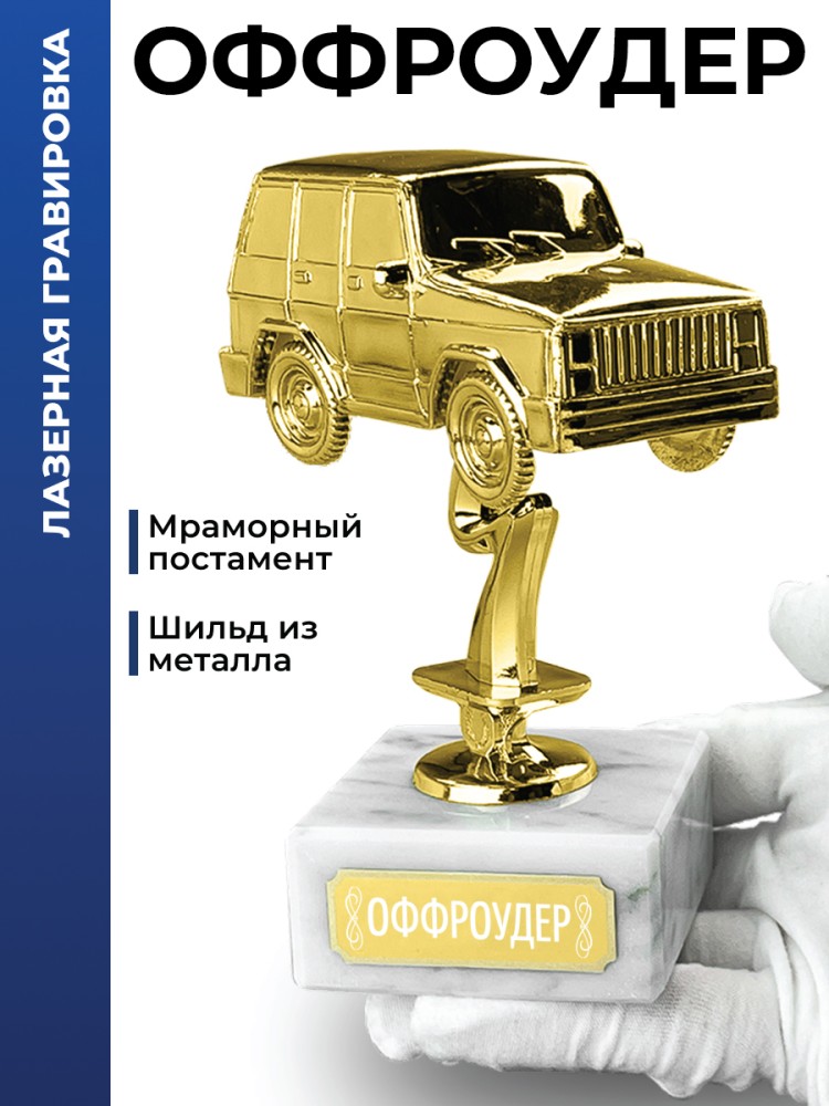 Наградная статуэтка с фигурой внедорожника на подставке. Подходит для размещения в интерьерах автоклубов и коллекциях призовых трофеев.