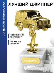 Наградная статуэтка с фигурой внедорожника на подставке. Подходит для размещения в интерьерах автоклубов и коллекциях призовых трофеев.