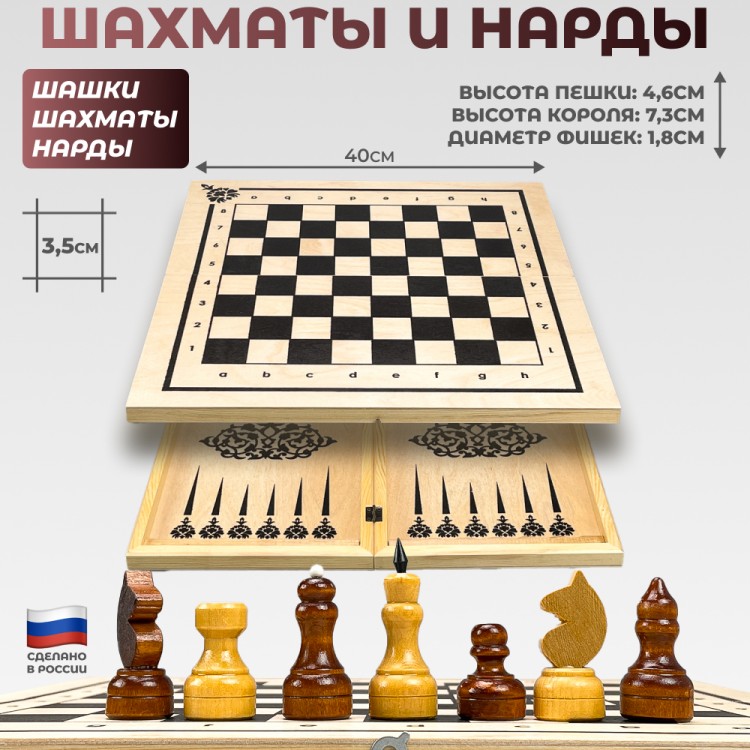 | Комплектация | Деревянная доска, Шахматные фигуры, фишки для шашек и нард, Пластиковые зары (2 шт), Инструкция |