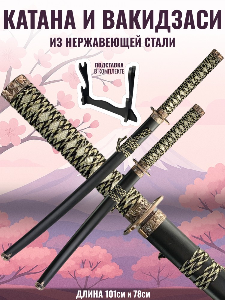 Набор из двух самурайских мечей катана (длинного) и вакидзаси (короткого) на деревянной подставке.