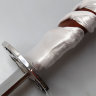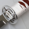 Намотка выполнена в традиционном японском стиле белой атласной лентой. Гарда вырезана вручную с ручной штихельной гравировкой.