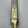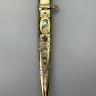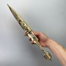 Кинжал - изысканное произведение искусства, выполненное с тщательным вниманием к каждой детали. Рукоятка украшена элегантным орнаментом и сверкающими фианитами, придающими клинку элитный и роскошный вид. Такой предмет идеально подходит для оформления интерьера дома или офиса, привнося в пространство утонченность и декоративный акцент.