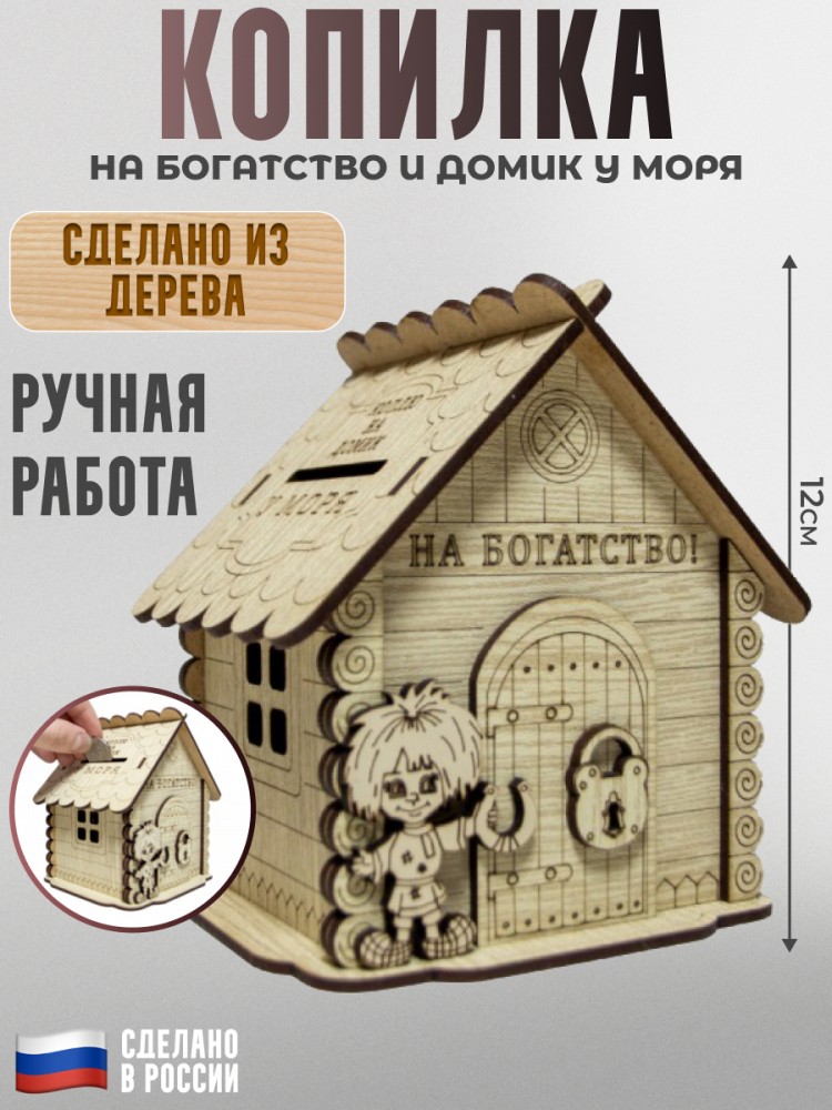 Копилка "На богатство и домик у моря" из дерева станет прекрасным мотиватором для накоплений и украшением интерьера. Ручная работа и качественные материалы делают эту копилку по-настоящему особенной.