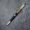 На рукояти кнопка-фиксатор для удержания кортика в ножнах. Комплектация: Офицерский кортик, ножны, сертификат (не требует разрешения на приобретение, хранение и ношение). Соответствует уставному, арсенальному Общая длина: 34 см., без ножен: 31 см. Длина клинка: 20,5 см. Наибольшая ширина клинка: 1,7 см. Материал клинка: нержавеющая кованая сталь 65Х13. Производство: Россия (Ворсма, Нижегородская область). Ослабление/деактивация: Согласно прилагаемому сертификату, твёрдость 25 HRC. Конструкция разборная, "под гайку", с хвостовиком без пропила. Материал рукояти: латунь (тыльник, гарда), аминопласт (рукоять) Материал ножен: дерево (внутренняя основа), латунь (металлическая оправа, наконечник и обоймицы с колечками для портупейных ремней), искусственная кожа (обтяжка). Вес с ножнами: 270 г. без ножен: 150 г. Авиационный кортик военно-воздушных сил (ВВС России) - является настоящим воплощением военной авиации, традиции и элегантности летной службы. Оригинальный подарок для мужчин разного возраста (папе, сыну, брату) или статуса (другу, любимому парню, коллеге от коллектива). Актуально в качестве новогоднего сюрприза мужу, отцу, коллеге, начальнику или юбиляру. Подарок военному лётчику ВВС станет особым знаком уважения и признательности. Презент подойдёт представителю боевой или тыловой авиации, будь то самолёт - бомбардировщик, истребитель, штурмовик или грузовой. Военный самолёт используется в составе военно-воздушных сил, включая боевую и тыловую авиацию. Управляют ею лётчики (часто ошибочно называемые пилотами) - военнослужащие асы разных категорий: курсанты, офицеры и ветераны. Уместен на День ВВС, 23 февраля, по случаю выпуска из училища, повышения в звании, завершения службы или просто в знак гордости за близкого человека. 21885