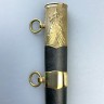 Материал ножен: дерево (внутренняя основа), латунь (металлическая оправа, наконечник и обоймицы с колечками для портупейных ремней), натуральная кожа (обтяжка).