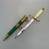 На рукояти кнопка-фиксатор для удержания кортика в ножнах. Комплектация: Офицерский кортик, ножны, сертификат (не требует разрешения на приобретение, хранение и ношение). Соответствует уставному, арсенальному Общая длина: 34 см., без ножен: 31 см. Длина клинка: 20,5 см. Наибольшая ширина клинка: 1,7 см. Материал клинка: нержавеющая кованая сталь 65Х13. Производство: Россия (Ворсма, Нижегородская область). Ослабление/деактивация: Согласно прилагаемому сертификату, твёрдость 25 HRC. Конструкция разборная, "под гайку", с хвостовиком без пропила. Материал рукояти: латунь (тыльник, гарда), аминопласт (рукоять) Материал ножен: дерево (внутренняя основа), латунь (металлическая оправа, наконечник и обоймицы с колечками для портупейных ремней), натуральная кожа (обтяжка). Вес с ножнами: 270 г. без ножен: 150 г. Кортик пограничной службы Федеральной службы безопасности Российской Федерации (ПС ФСБ) - является настоящим воплощением службы на границе и элегантности пограничной службы. Оригинальный подарок, который подойдет на любой праздник или награждение. Он станет достойной памятной наградой за победы и достижения от коллектива на память. Сувенир символизирует не только личные успехи, но и благодарность за труд и преданность делу. Актуально в качестве новогоднего сюрприза мужу, отцу, взрослому родственнику, преподавателю или юбиляру. Считается хорошим корпоративным подарком как для мужчин (папе, дедушке, руководителю, сыну подростку, брату, другу, любимому парню, начальнику). Подарок пограничнику - ко Дню пограничника (28 мая), на день рождения, за выслугу лет или при награждении. Подходит действующему бойцу, командиру или ветерану пограничных войск. Уместен как знак признания за службу по охране рубежей, обеспечению государственной безопасности и верность присяге. 21885