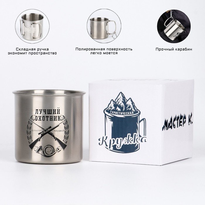 Кружка сделана из металла, на корпусе имеет складные ручки для экономии места.