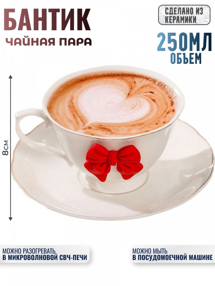 Материал: Керамика (чайная пара), Пластик (бантик на кружке), Металл (ложка).