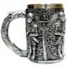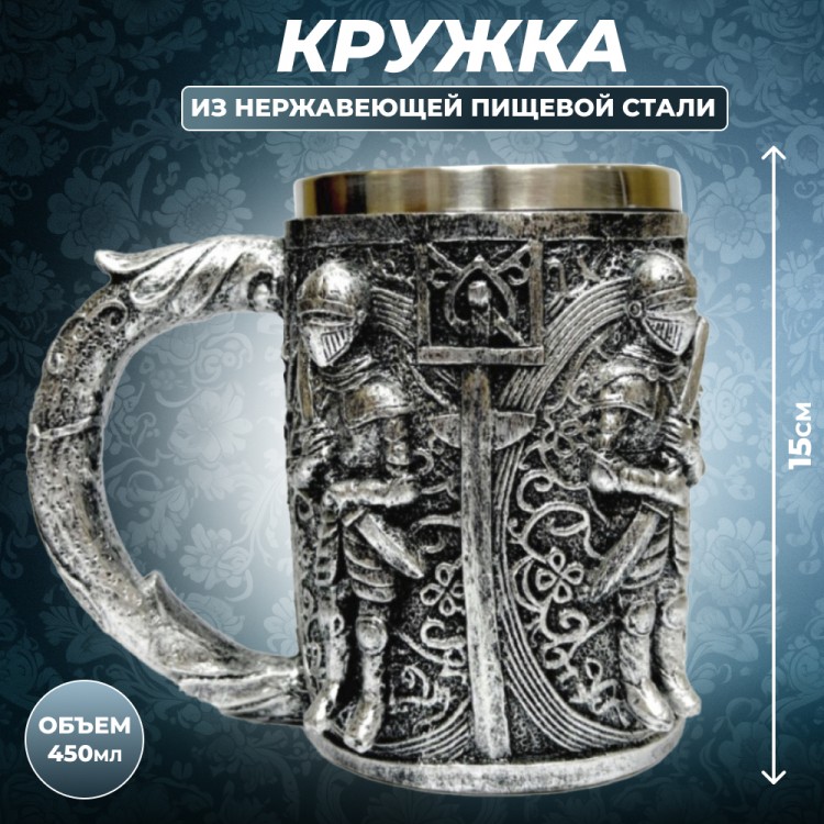 Кружка с металлической вставкой и оформлением в рыцарской тематике - аксессуар для подачи горячих и холодных напитков. Вместимость позволяет использовать её для чая, кофе, эля, сока, вина, воды или сбитня. Внутренняя часть выполнена из стали, внешний декор - из полистоуна с объёмным изображением воинов в доспехах и скрещёнными мечами. Такая посуда подойдёт в подарок мужчине, поклоннику истории, средневековой эстетики, реконструктору или ценителю антуражных вещей. Используется как коллекционная кружка, предмет интерьера, тематический элемент для дома, ролевых игр или фотосессий.