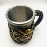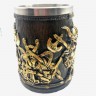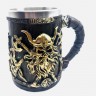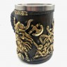 Пивная кружка с металлической вставкой и оформлением в стиле скандинавских воинов - это тематический аксессуар для подачи холодных и горячих напитков. Вместимость делает её удобной для пива, кваса, глинтвейна, эля, сока или воды. Внутренний резервуар изготовлен из стали, внешний корпус - из полистоуна с фактурным рисунком и элементами викинг-символики.