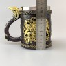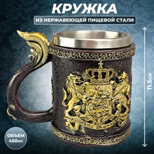Кружка с металлической вставкой и оформлением в виде фамильного герба - это атмосферный аксессуар для подачи как горячих, так и холодных напитков. Вместимость позволяет пользоваться ею для кофе, чая, глинтвейна, пива, лимонадов или воды. Внутренний резервуар изготовлен из стали, внешний декор - из полистоуна с рельефной отделкой. Такая ёмкость подойдёт в подарок мужчине, коллеге, другу или ценителю heraldic (геральдического) стиля, исторической эстетики и оригинальных предметов. Можно использовать как интерьерное украшение, тематический реквизит, коллекционный экземпляр или нестандартную посуду для дома, офиса, дачи или тематических мероприятий