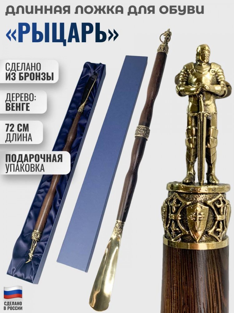 Длинная сувенирная ложка для обуви “Рыцарь”, изготовленная из бронзы и дерева венге, - это стильный и функциональный аксессуар, который облегчает