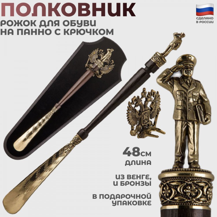 Изящная бронзовая ложка для обуви "Полковник" на декоративном панно с крючком.