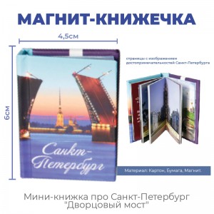 Открывая страницы магнит-книжечки о Дворцовом мосте, вы вновь переживете волшебство белых ночей и красоту невских вод.