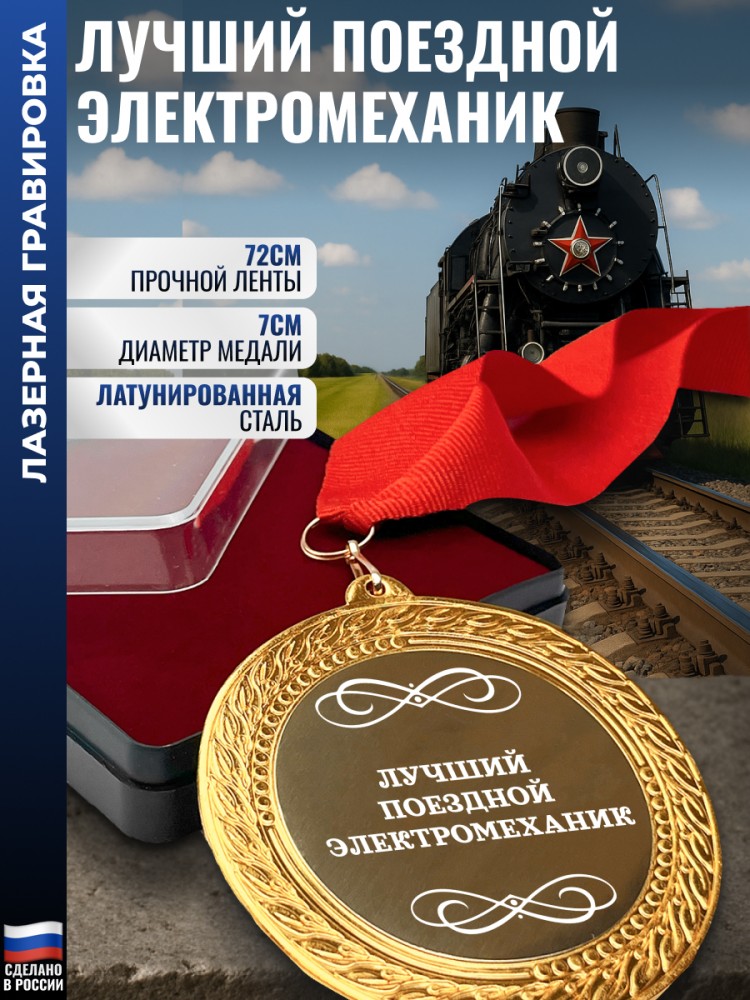 Лазерная гравировка нанесена с лицевой стороны медали. Комплектация: Медаль (Латунированная сталь), Жаккардовая лента, Подарочный футляр. Подложка (ложемент) в коробочке с бархатным покрытием (флокированием). Размер упаковки: 8,5 x 8,5 x 2 см. Размер медали: 7 x 7 x 0,3 см. Длина ленты: 72 см. Ширина ленты: 2,5 см. Крепление к ленте на маленьком металлическом карабине. Вес медали с лентой: 65 г. Наградные медали и ордена золотого цвета символизируют не только личные достижения и успехи, но и благодарность за труд и преданность своему делу. Такой знак отличия всегда найдет свое почетное место в доме или офисе и будет стильным украшением на празднике. Сувенир станет отличной памятной наградой за заслуги или победы. Он подходит для корпоративных и личных наград, на юбилей или Новый год Актуально как подарок в качестве сюрприза от коллектива, друзей и близких на день рождения и другие значимые события. Символично подчеркнёт значимость профессии железнодорожника - работника, обеспечивающего бесперебойную и безопасную работу транспортной сети. Подходит машинисту, проводнику, дежурному по станции, путейцу, стрелочнику или осмотрщику. Всем, кто связан с движением, обслуживанием или ремонтом составов. Актуален ко Дню железнодорожника (в первое воскресенье августа), при вручении ведомственной награды, юбилее или выходе на пенсию. Такой подарок может выразить признание за преданность делу, вклад в развитие инфраструктуры и годы службы в отрасли. Подойдёт диспетчеру, электромонтёру, инженеру, технику, паровознику или сотруднику локомотивного депо — всем, чья работа связана с эксплуатацией, регулировкой движения и обслуживанием ЖД-комплекса. 1485
