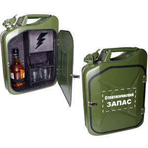 Канистра сделана из металла, внутренний ложемент из дерева.
