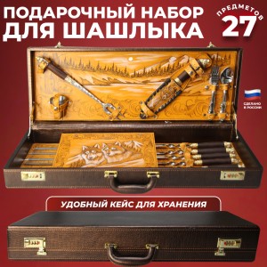 Подарочный набор для пикника или охоты (Россия) с плоскими шампурами - комплект аксессуаров для приготовления мяса на огне и подачи блюда к столу на природе.