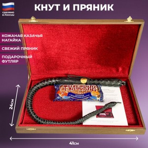 Комплектация: Казачья нагайка (кнут), Тульский пряник, Деревянный футляр.