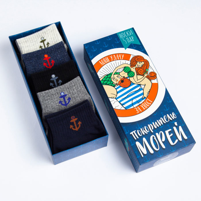 Набор мужских носков "Покорителю морей" включает в себя пять пар носков, идеально подходящих для размеров обуви 39-43. Высококачественный состав материалов обеспечивает комфорт и долговечность.