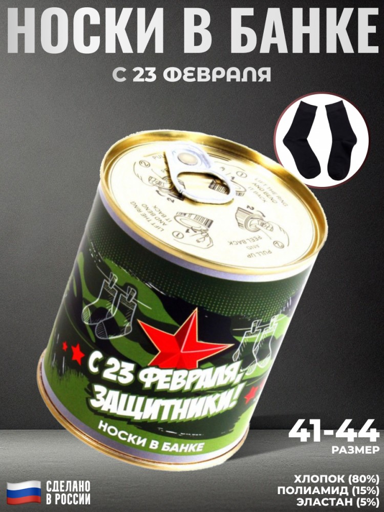 Носки в жестяной банке - это прекрасный и уникальный подарок для вашего мужчины. Эти консервированные носки упакованы в оригинальную железную баночку, которая плотно закрыта. Банка абсолютно герметична, поэтому вы можете взять эти носки с собой в любые экстремальные условия, будучи уверенными, что они останутся сухими. Носки изготовлены из наиболее современных и удобных материалов. Этот состав делает их комфортными, удобными и прочными. Кроме того, благодаря их герметичной упаковке, такой необычный сувенир станет отличным вариантом для рыбаков, охотников и путешественников.