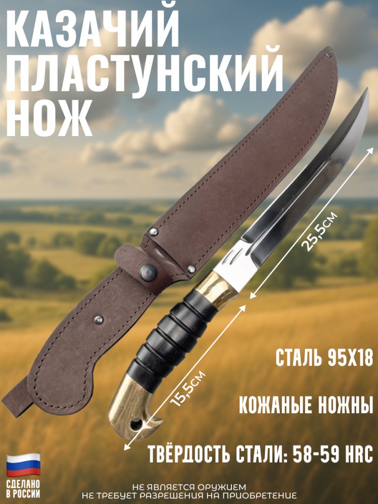 Комплектация: Пластунский нож, Кожаные ножны, Сертификат.