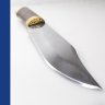 Нож изготовлен из коррозионностойкой стали с термообработкой, что обеспечивает износостойкость клинка и надёжность в эксплуатации. Рукоять выполнена из орехового дерева с латунными элементами, что повышает сцепление и устойчивость к влаге.